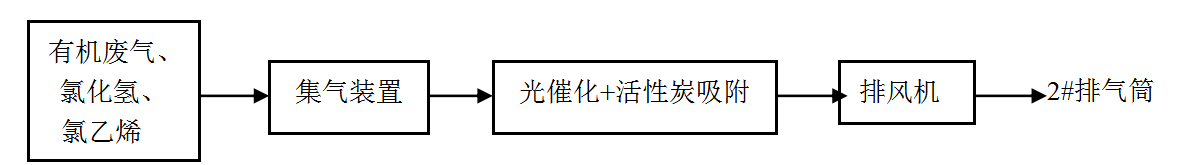 (一)擠出和注塑廢氣處理:廢氣經(jīng)集氣罩收集后進入UV光催化氧化+活性炭吸附裝置進行處理,廢氣收集率≥90%,非甲烷總烴和氯乙烯經(jīng)UV光催化氧化+活性炭吸附裝置處理率≥90%,氯化氫經(jīng)UV光催化氧化+活性炭吸附裝置處理率≥40%,風機風量為10000m3/h,最后經(jīng)15米高2#排氣筒排放。