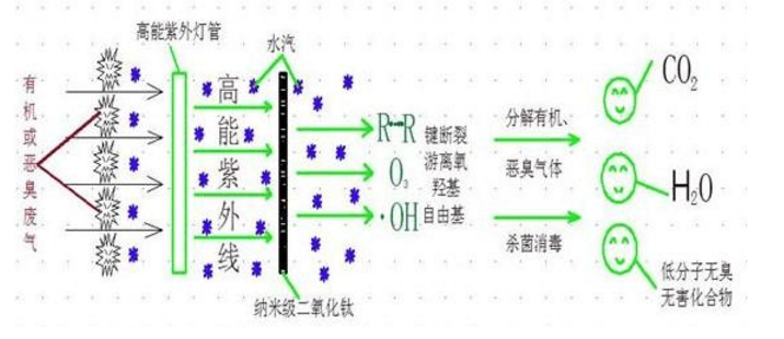 光催化工藝主要是由鑲嵌有納米二氧化鈦(TiO2)的泡沫鎳網(wǎng),產(chǎn)生254nm和185nm紫外線、電控系統(tǒng)及設(shè)備殼體等四大部分組合。光催化工藝能有效地去除部分揮發(fā)性有機物和無機化合物,如苯、甲醛、丙酮、氨、二氧化氮、硫化氫等。這些有害氣體可經(jīng)過二氧化鈦的催化作用被完全分解破壞,達到無機化,而不形成中間產(chǎn)物。