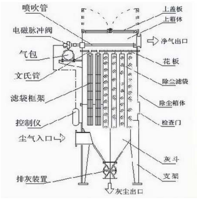 脈沖袋式除塵器清下粉塵落入灰斗經(jīng)排灰系統(tǒng)排出機體。由此積附在濾袋上的粉塵周期地脈沖噴吹清灰,使凈化氣體正常通過,保證除塵器的正常運行。