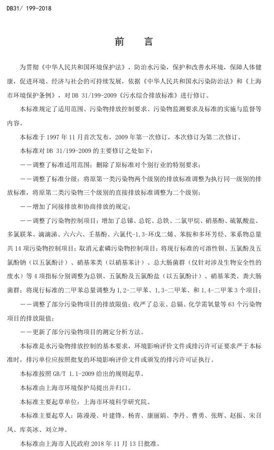 近日,上海市《污水綜合排放標(biāo)準(zhǔn)》發(fā)布,本標(biāo)準(zhǔn)對(duì)DB 31/199-2009的主要修訂之處如下: