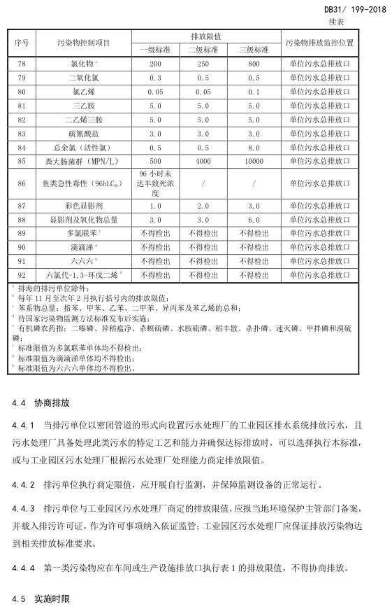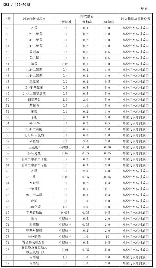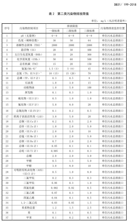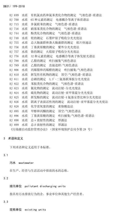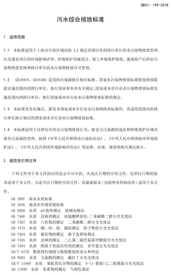 標(biāo)準(zhǔn)編號(hào)及名稱為:污水綜合排放標(biāo)準(zhǔn):DB31/199-2018,該標(biāo)準(zhǔn)自2018年12月1日起實(shí)施。