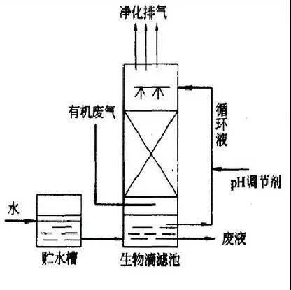 生物滴濾法是將廢氣經(jīng)過(guò)去塵增濕或降溫等預(yù)處理工藝后,從濾床底部由下向上穿過(guò)由濾料組成的濾床,廢氣由氣相轉(zhuǎn)移至水—微生物混和相,通過(guò)固著于濾料上的微生物代謝作用而被分解掉的一種方法。