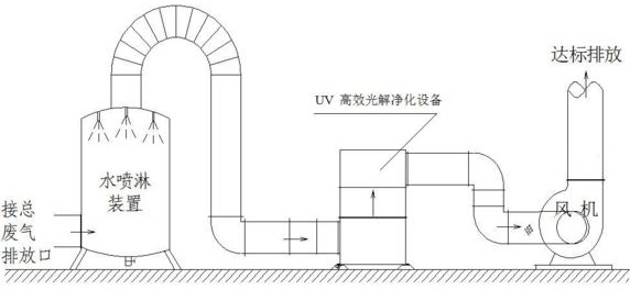 廢氣收集—進(jìn)風(fēng)管道—進(jìn)入噴淋塔利用液體水分解吸收有機(jī)廢氣—出風(fēng)—排風(fēng)管—光氧催化廢氣凈化器分解有機(jī)漆廢氣—風(fēng)機(jī)煙囪排出干凈的空氣。