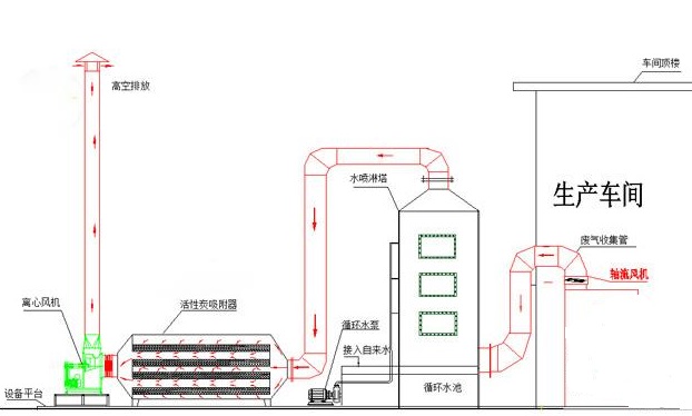 適用于處理濃度低廢氣成分不單一的廢氣,通過水淋塔可除去顆粒狀的粉塵、煙霧、油脂類物質(zhì),經(jīng)處理后的廢氣由活性炭吸附塔吸附,水淋塔的作用在于凈化廢氣防止顆粒狀的物質(zhì)阻塞活性炭吸附塔從而降低吸附效率。
